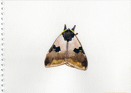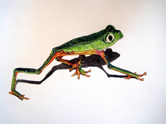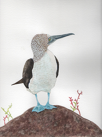 Acuarela. Watercolours. 1.Piquero de patas azules (Blue footed Booby) 2.Polilla (Moth) 3.Phyllomedusa Vaillanti. (White-lined leaf frog).